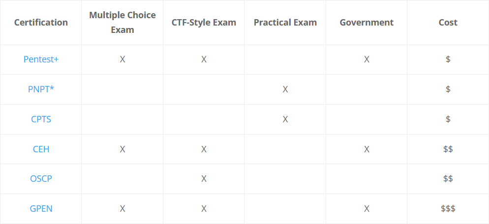 The next thing to discuss are certifications, which can be useful for standing out in the job application process. Below are some of the top entry-level hacking certifications that can be found on job postings, sorted by price. If you’re interested in taking a certification, we recommend researching each certification individually and finding one that best suits your journey.