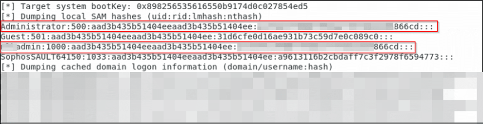 If you look carefully, we only dump out four accounts: Administrator, Guest, an admin account, and a Sophos account. The hashes for the Administrator account and this partially obfuscated admin account are identical. That means the passwords are identical. We now have a new account name to work with and we know there is Sophos on these machines.